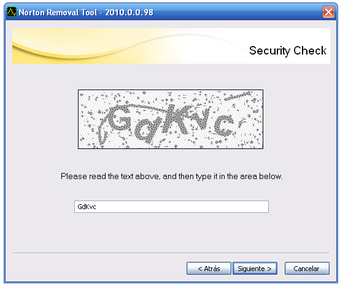 El asistente de Norton Removal Tool consta de unos pocos pasos; con pulsar Siguiente unas cuantas veces habrás liberado tu sistema de la presencia de Norton. El único engorro consiste en tener que introducir un código de seguridad (o captcha) antes de proceder con la limpieza.